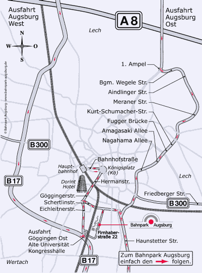 Anfahrtsskizze zum Blue Star Train im Bahnpark Augsburg,